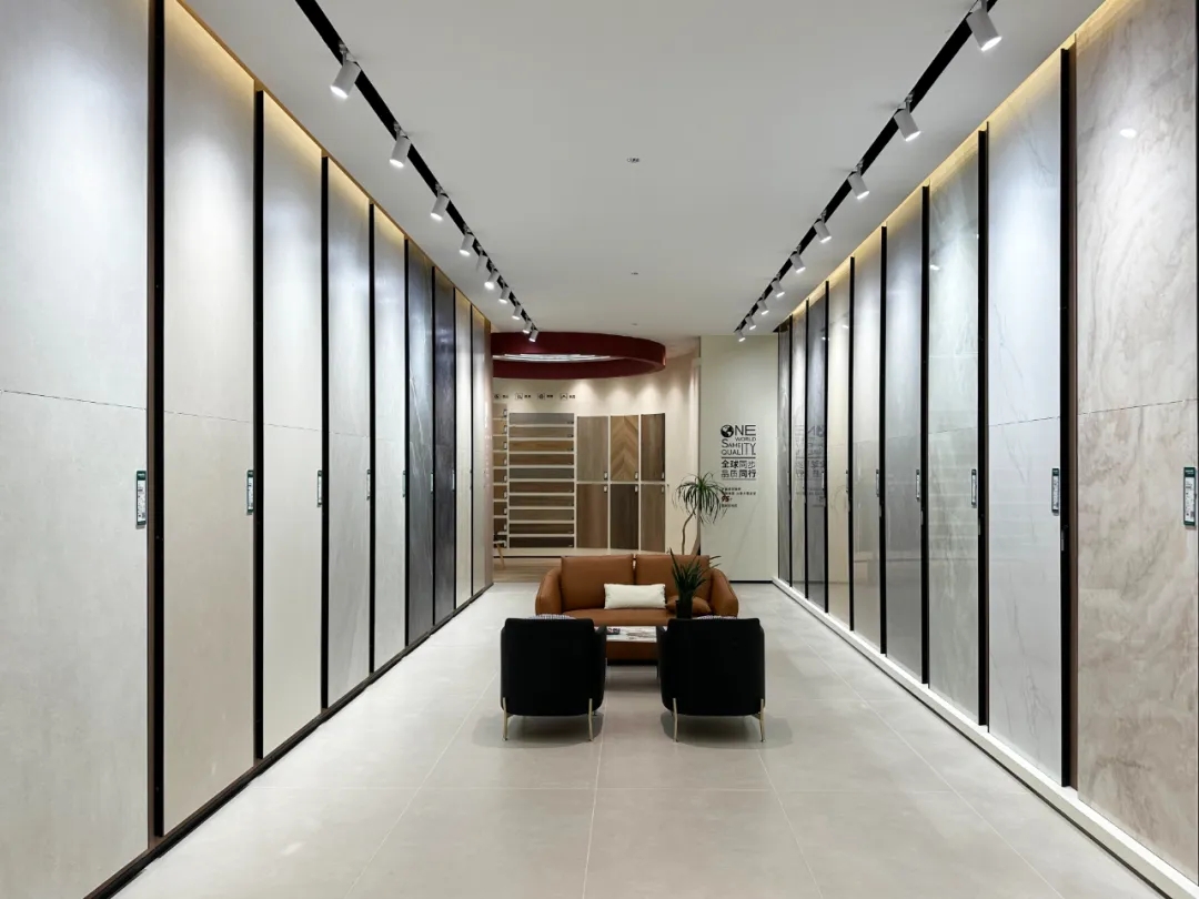 不同規(guī)格產(chǎn)品選材區(qū)穿插在各空間展示區(qū)中,產(chǎn)品按品類集中分區(qū)的布局增加產(chǎn)品系列化與產(chǎn)品整體飽滿感,所展示的產(chǎn)品皆為時(shí)下流行的大規(guī)格產(chǎn)品,讓空間與產(chǎn)品的層次性得到充分展現(xiàn)。